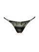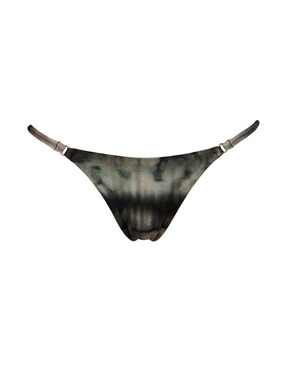 Tanga lateral estreita estampada. O modelo possui cobertura pequena, regulagem nas laterais, acabamento embutido e detalhes de metal no banho de Ouro Fosco.