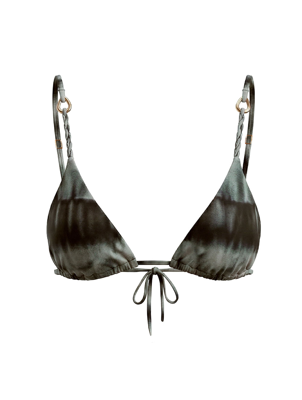 Top cortininha estampado. O modelo possui bojo removível, alças fixas trabalhadas com detalhe de metal e regulagem no banho Ouro Fosco.