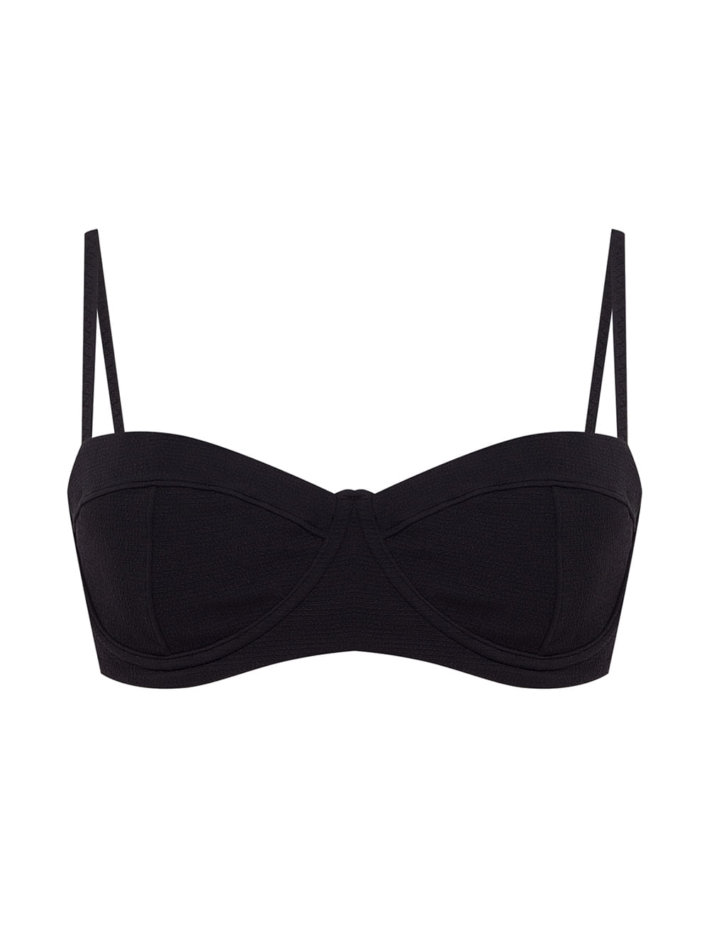 Top meia taça. O modelo é trabalhado em tecido com textura, possui bojo removível, aro, alças fixas com regulagem e fecho de ímã nas costas no banho de Ouro Velho.