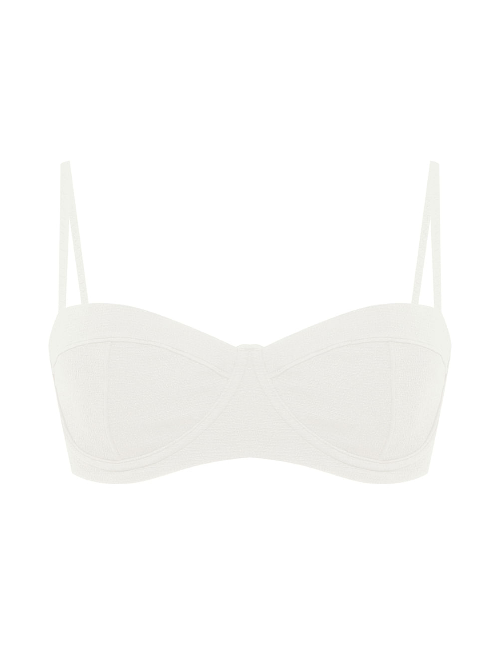 Top meia taça. O modelo é trabalhado em tecido com textura, possui bojo removível, aro, alças fixas com regulagem e fecho de ímã nas costas no banho de Ouro Velho.