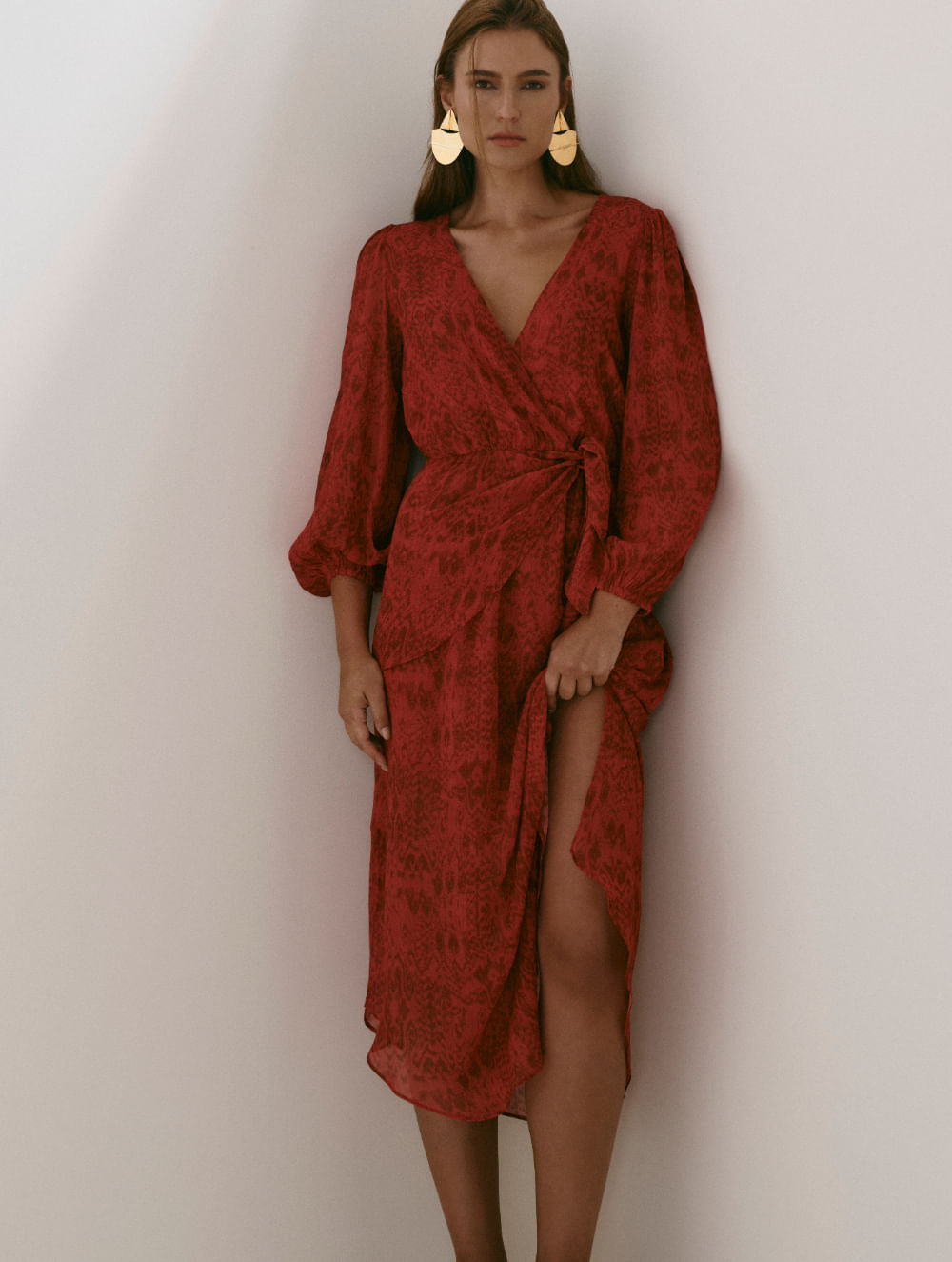 Vestido midi estampado. O modelo possui caimento leve e fluido, decote em V deepneck com transpasse, manga longas com elástico no punho, amarração na cintura com detalhe de ponteira com alinhavo handmade e forro interno.