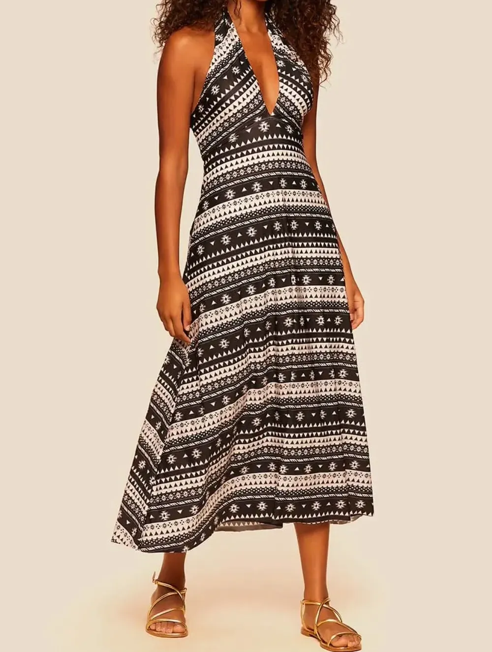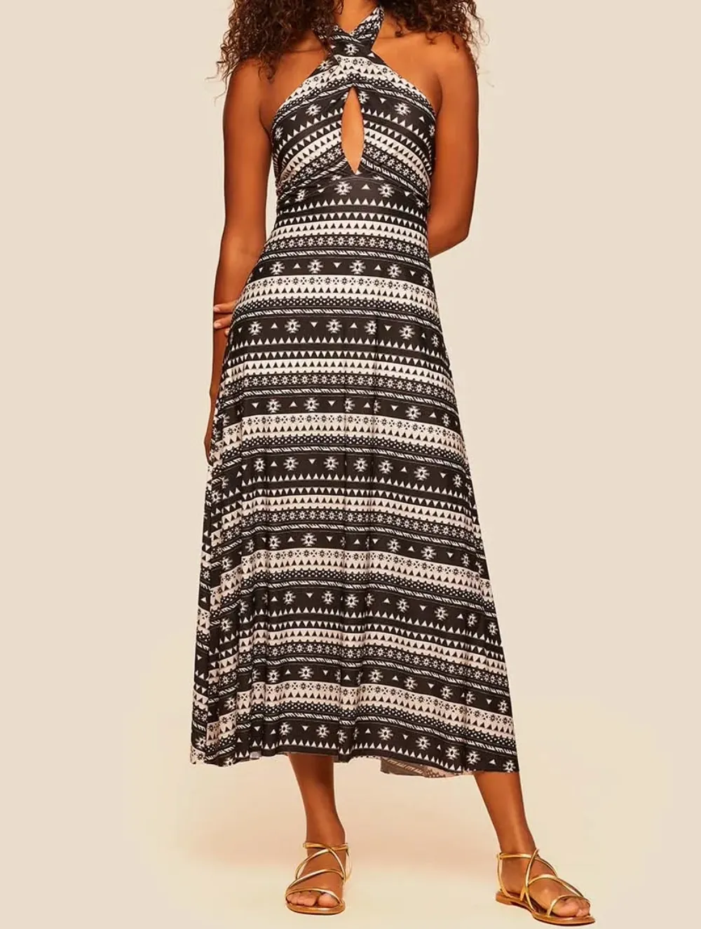 Vestido midi estampado. O modelo possui decote cruzado amarrado no pescoço, detalhe vazado em formato de gota, decote costas levemente arredondado e Peça possui forro curtinho.